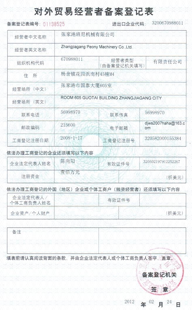 1. Standard:对外贸易经营者备案登记表 (Sistema di registrazione degli operatori commerciali esteri)